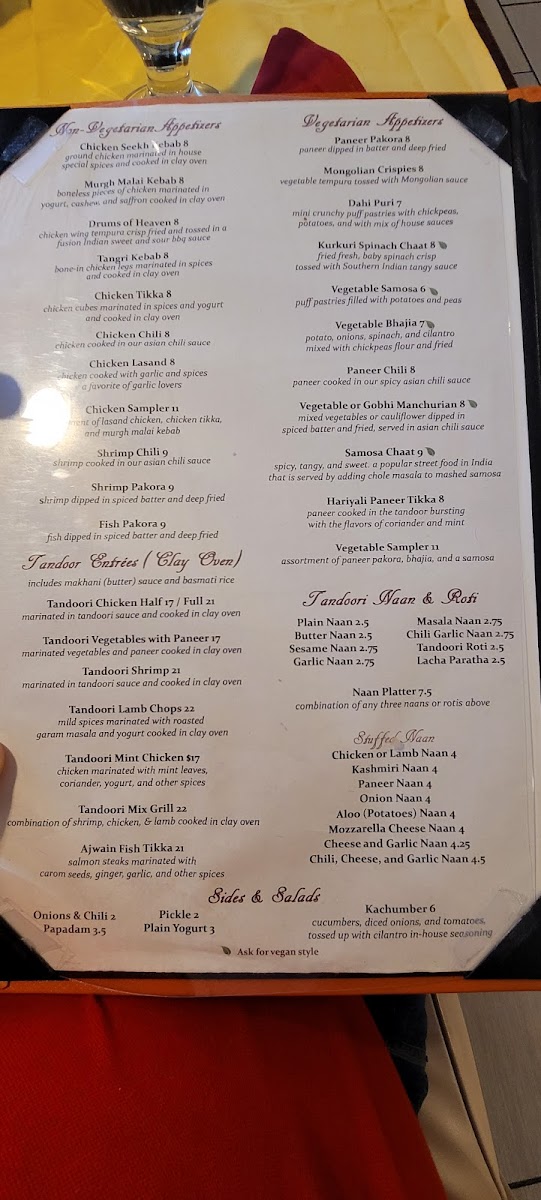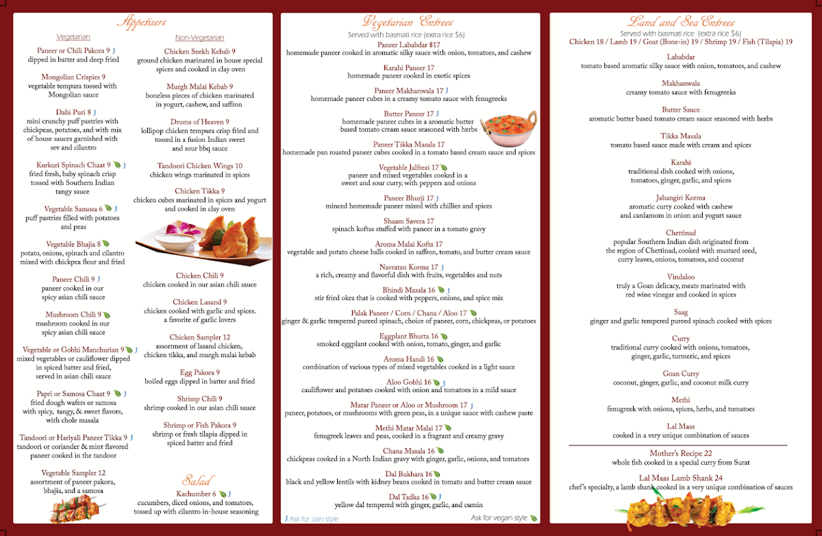 Ginger and garlic tempered pureed spinach, cooked with choice of paneer, corn, chickpeas, or potatoes.